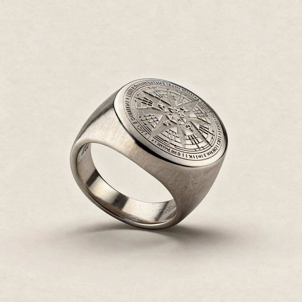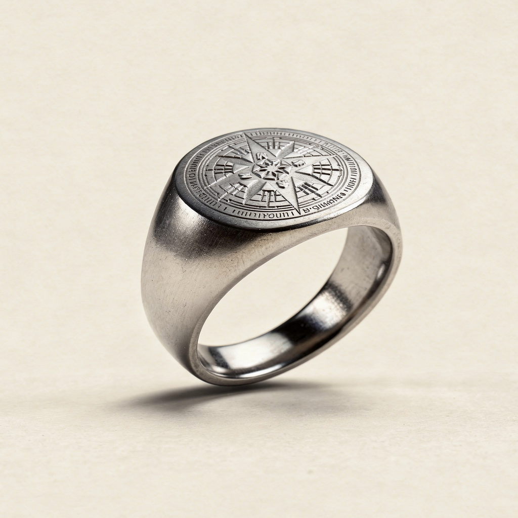 El COMPÁS SILVER es un anillo tipo sello con brújula grabada y acabado silver satinado. Minimal, sólido y con significado: una pieza para llevar dirección contigo, sin necesidad de decir nada. Se nota por el detalle, no por el exceso.