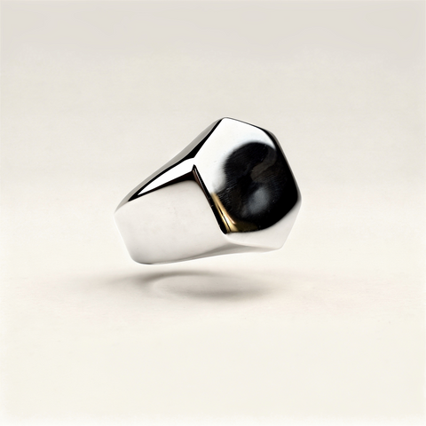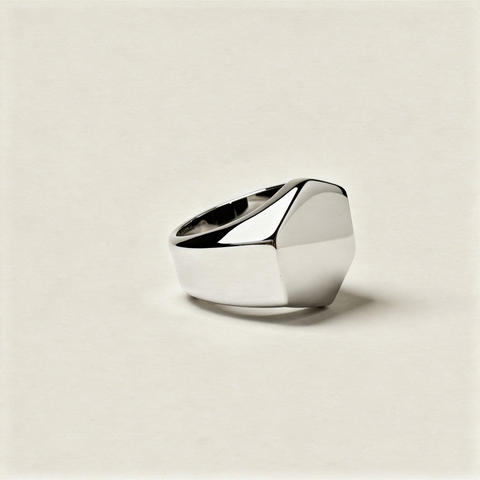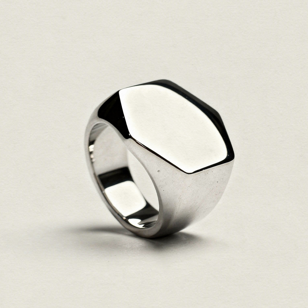 EXA SILVER es una pieza que transmite autoridad desde la simplicidad. Su diseño tipo sello con superficie hexagonal pulida redefine el clásico anillo signet en una versión moderna, limpia y contundente.